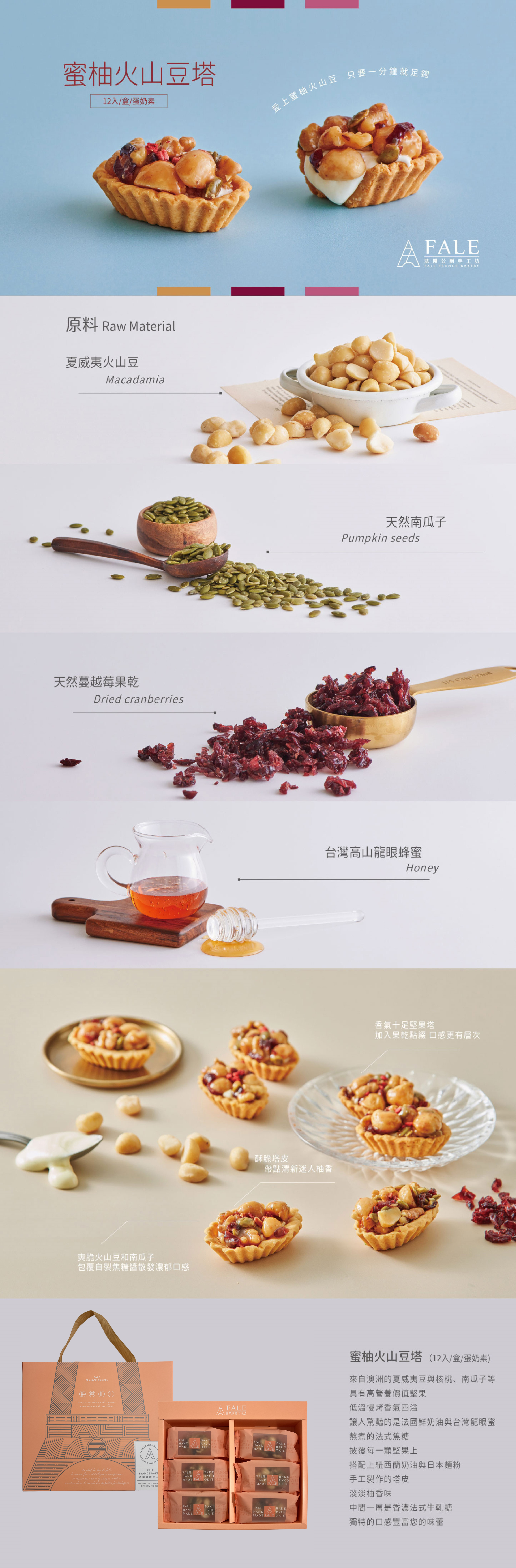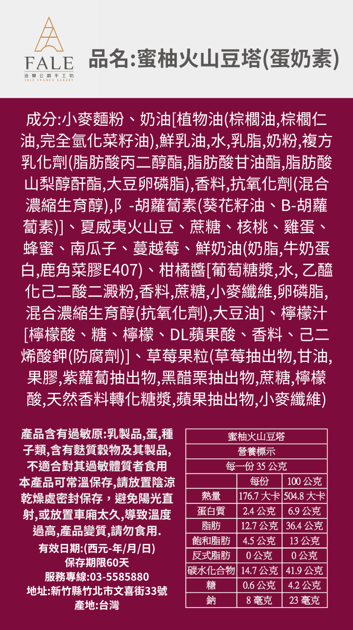 •蜜柚火山豆塔:夏威夷火山豆、蔓越莓、南瓜子、柑桔醬、台灣蜂蜜、三溫糖、雞蛋、鮮奶油、麥芽、麵粉、無鹽奶油