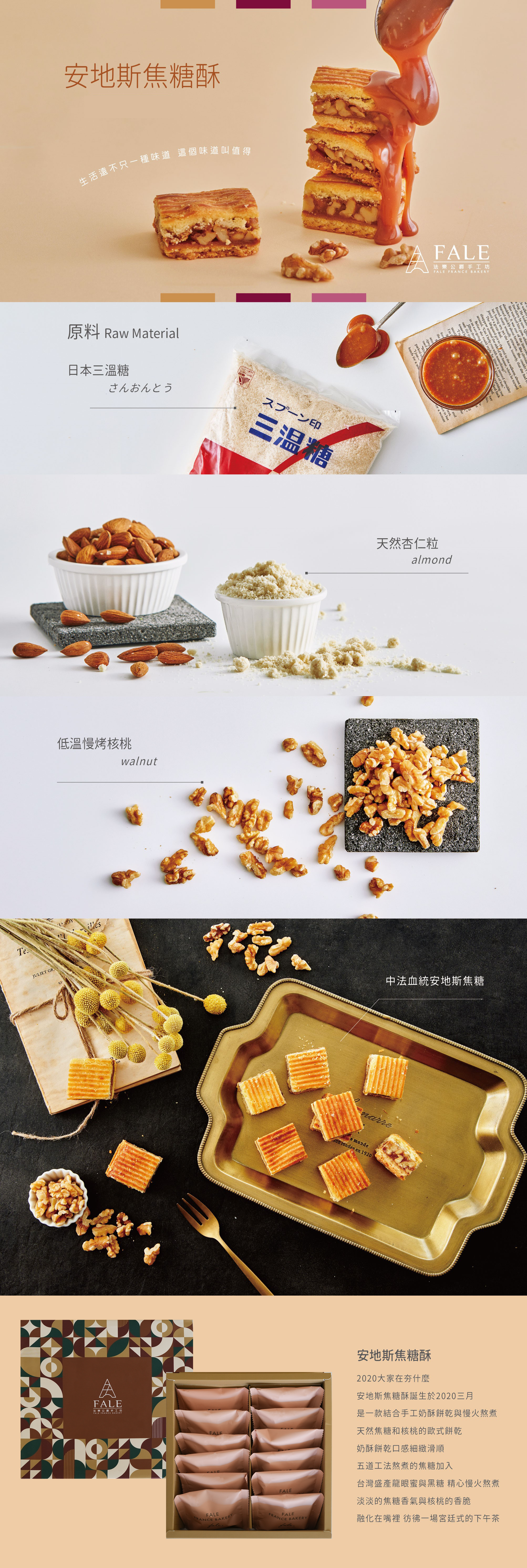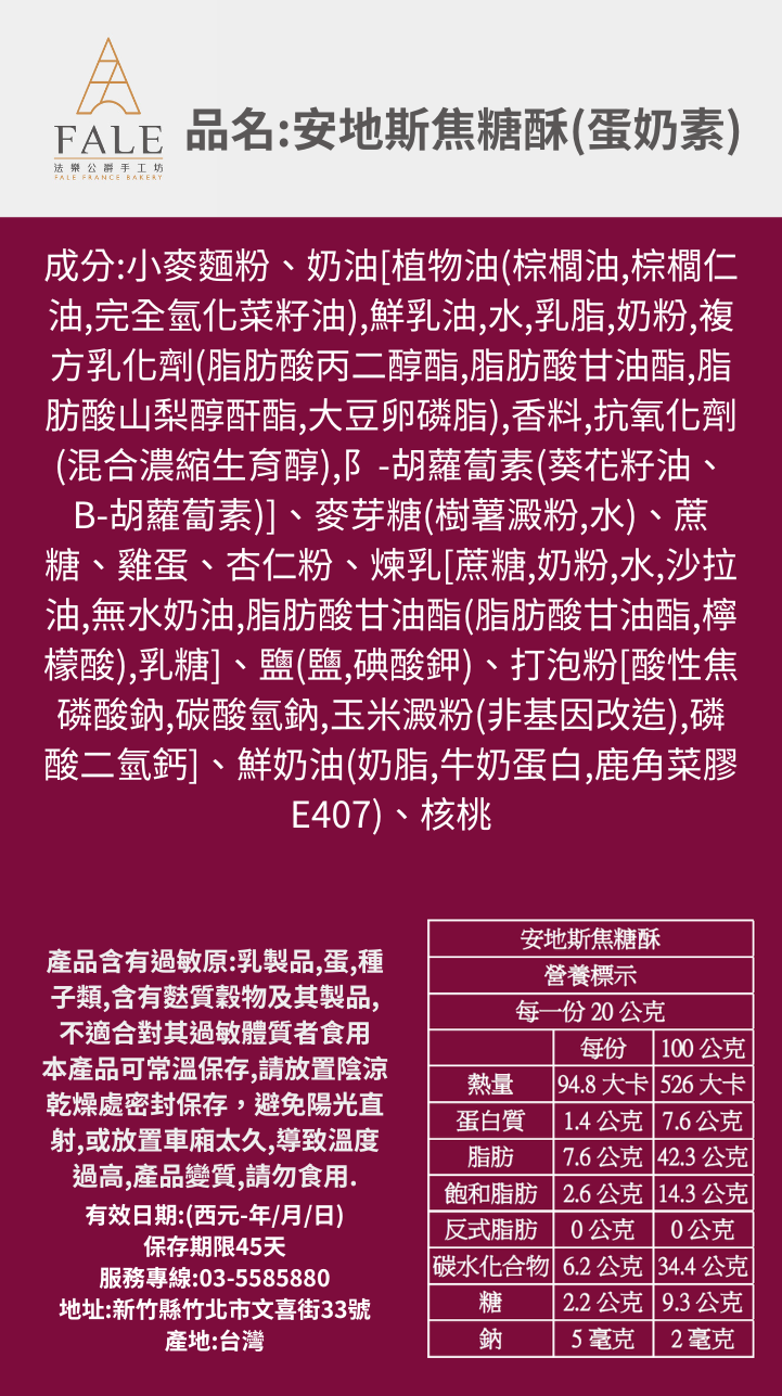 •安地斯焦糖酥:奶油、砂糖、土雞蛋、杏仁粉、麵粉、麥芽、核桃、鹽之花、蜂蜜
