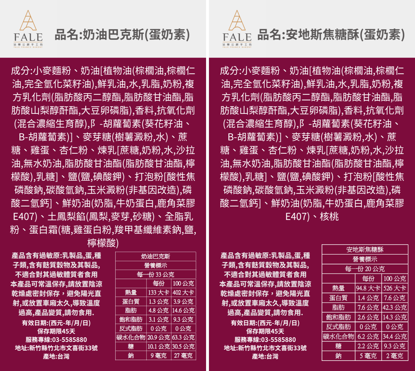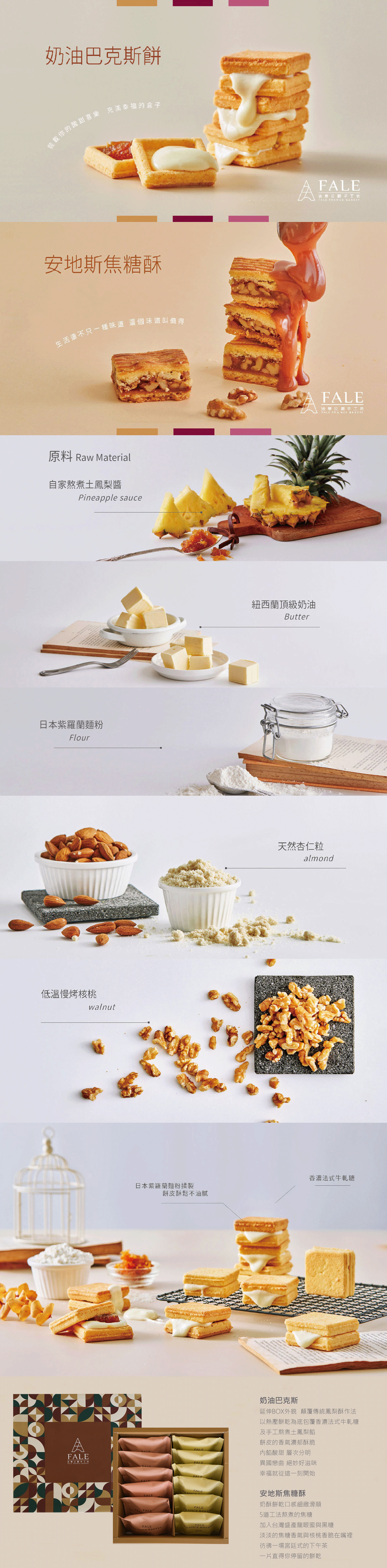•安地斯焦糖酥:奶油、砂糖、土雞蛋、杏仁粉、麵粉、麥芽、核桃、鹽之花、蜂蜜