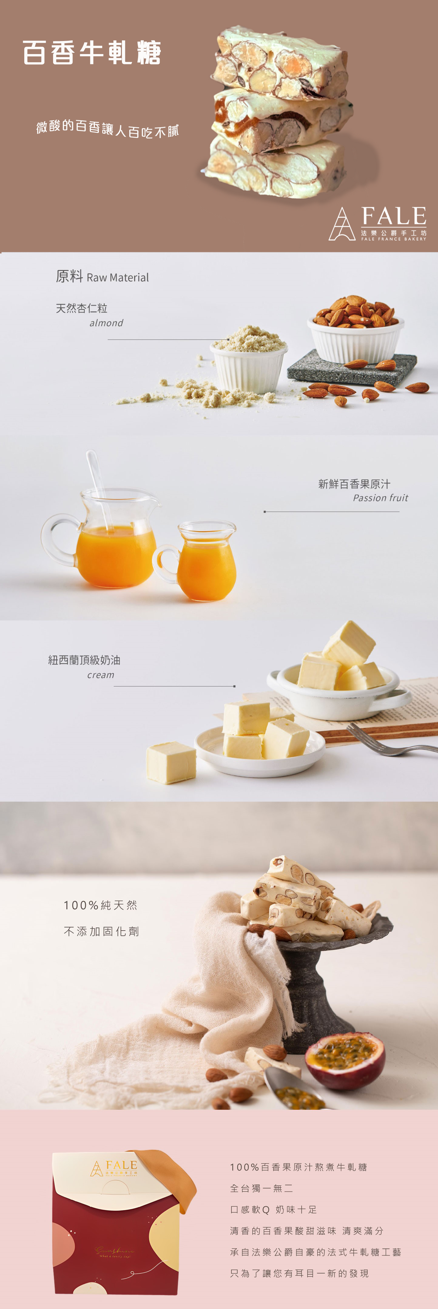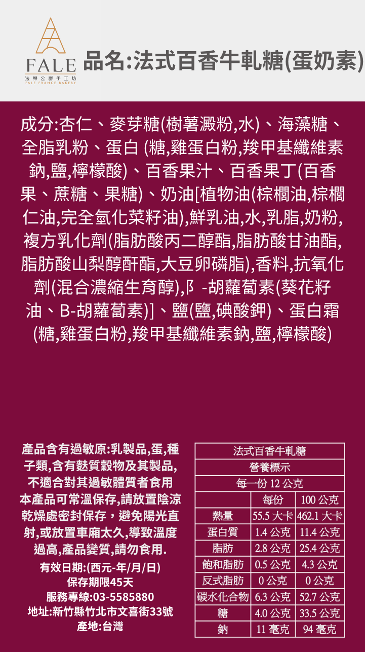 •法式百香牛軋糖:麥芽、奶粉、蛋白、海藻糖、法國奶油、百香果汁、杏仁、鹽