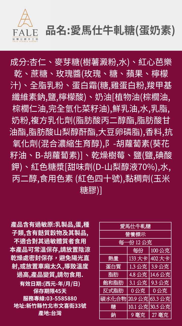 •愛馬仕牛軋糖:麥芽、奶粉、蛋白、海藻糖、法國奶油、