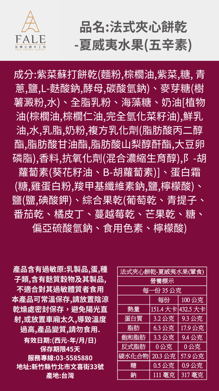 •夏威夷水果夾心餅:奶粉、蛋白、麵粉、酵母、法國奶油、海藻糖、麥芽、鹽、綜合果乾、紫菜、青蔥