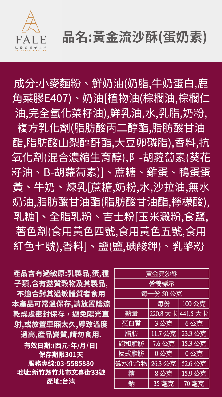 日本紫羅蘭麵粉、紐西蘭頂級奶油、鹹蛋黃、鹽、糖、雞蛋、吉士粉、牛奶、奶粉、 奶粉精、乳酪粉、海草膠、香草香料