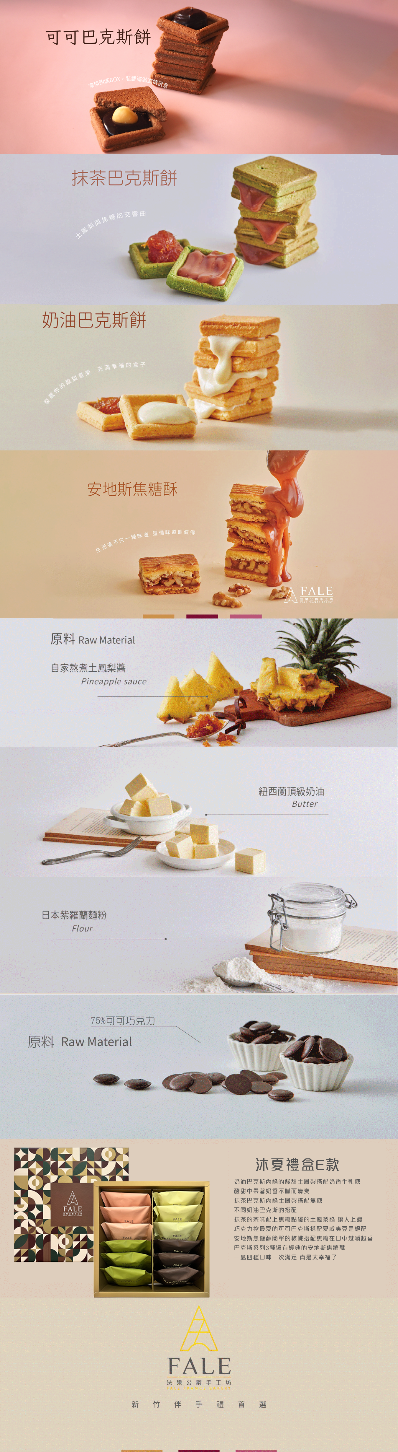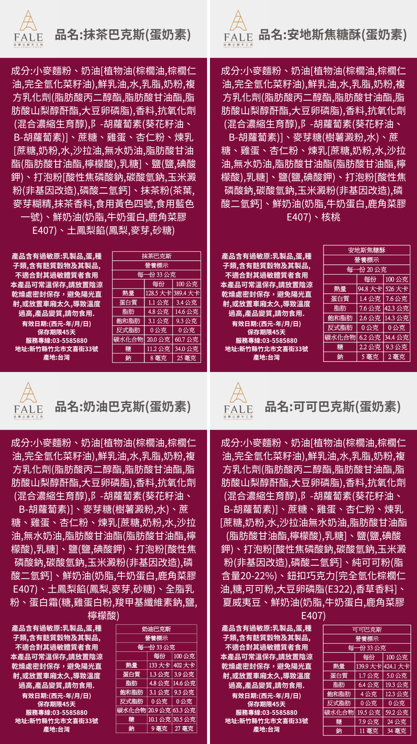 •安地斯焦糖酥:奶油、砂糖、土雞蛋、杏仁粉、麵粉、麥芽、核桃、鹽之花、蜂蜜